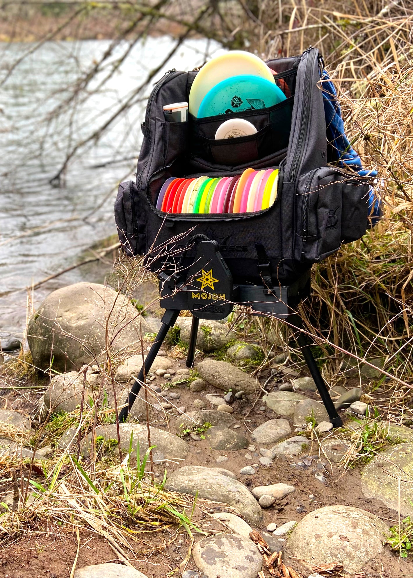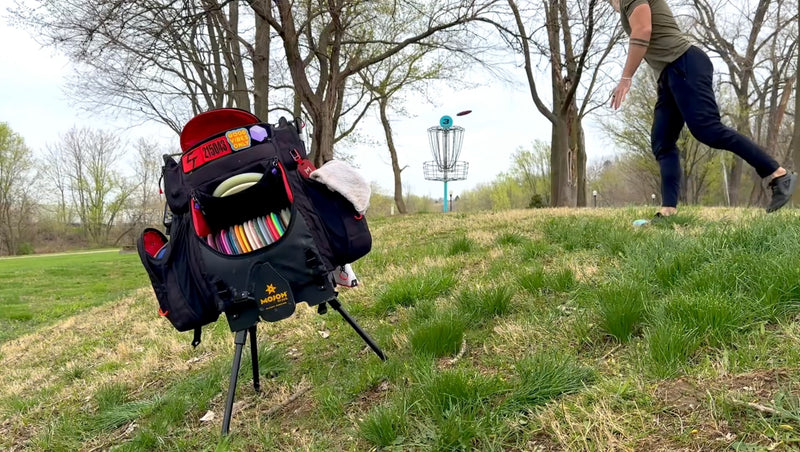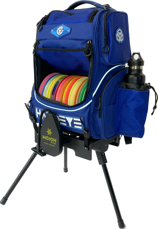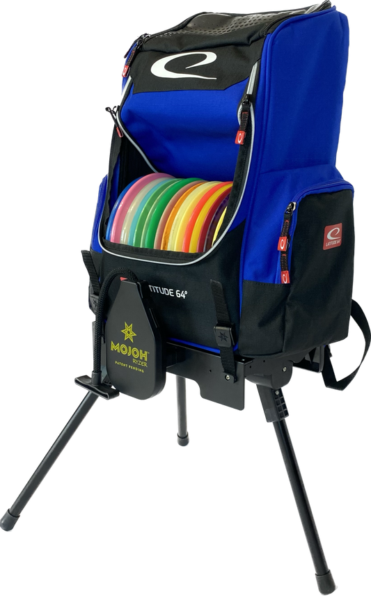 The Mojoh Ryzer is a must-have for disc golfers looking to up their mojo on the course! This clever stand attaches to most backpack-style disc golf bags, creating a sturdy tripod that elevates your bag 14 inches off the ground. With a simple pull of the handle, the three legs extend, providing a clean, stable spot to keep your gear. No more bending over to pick up your bag, and no more worries about your bag getting dirty or wet. Plus, the lightweight design won't weigh you down during long rounds. Give your game a lift with the Mojoh Ryzer!
